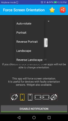 This app is developed to force change orientation of phones (smartphones or tablets) having faulty orientation sensors or Android OS with rotation issues. You can easily force landscape or portrait mode in any apps you have.